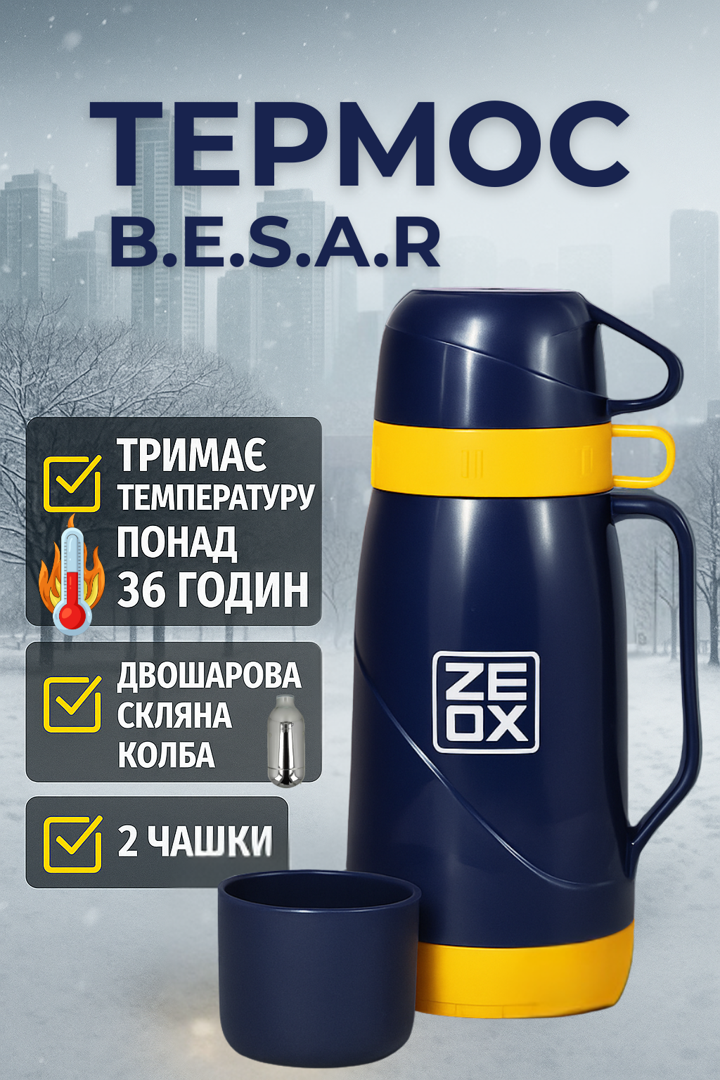 B.E.S.A.R вирішує головну проблему доступних термосів — він не протікає, не б’ється та не втрачає температуру навіть через тривалий час, забезпечуючи комфорт та надійність у будь-якій ситуації.